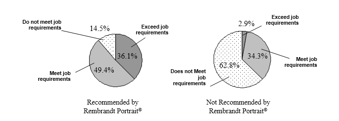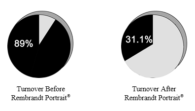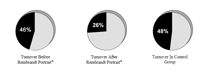 As you will see from the following study outcomes Rembrandt Portrait© is highly predictive when used as a job matching tool, with recommended candidates outperforming non-recommended candidates at a better than 2.5 to 1 margin. This is outlined in exhibits one and two. Because Rembrandt Portrait© is so highly predictive of job success, it has proven capability to dramatically reduce selection-based employee turnover (turnover incurred in the first 6 months of employment). In study after study, Rembrandt Portrait© has been able to reduce selection-based turnover by more than 50% (see exhibit 3 & 4). Finally, we have outlined the impact that Rembrandt Portrait© has on protected classes of employees. In exhibit 5 you will see that Rembrandt Portrait© has no adverse impact on protected classes of employees and actually supports fair and equitable hiring practices by identifying the right person for the right position, regardless of age, sex, race, religion, national origin and sexual orientation.